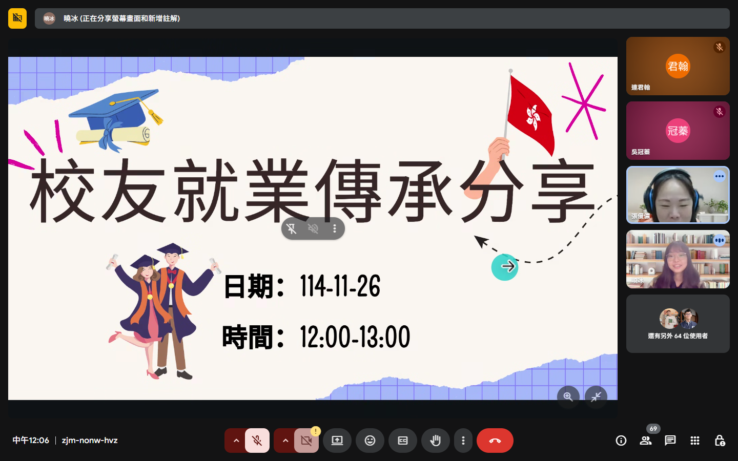 為協助本校學生了解不同地區的就業環境與職涯發展方向,國際事務處特別舉辦「校友就業分享活動」,邀請來自馬來西亞與香港的優秀畢業校友線上分享自身求職經驗與職場心得。活動吸引多位同學踴躍參與,反應相當熱烈。
